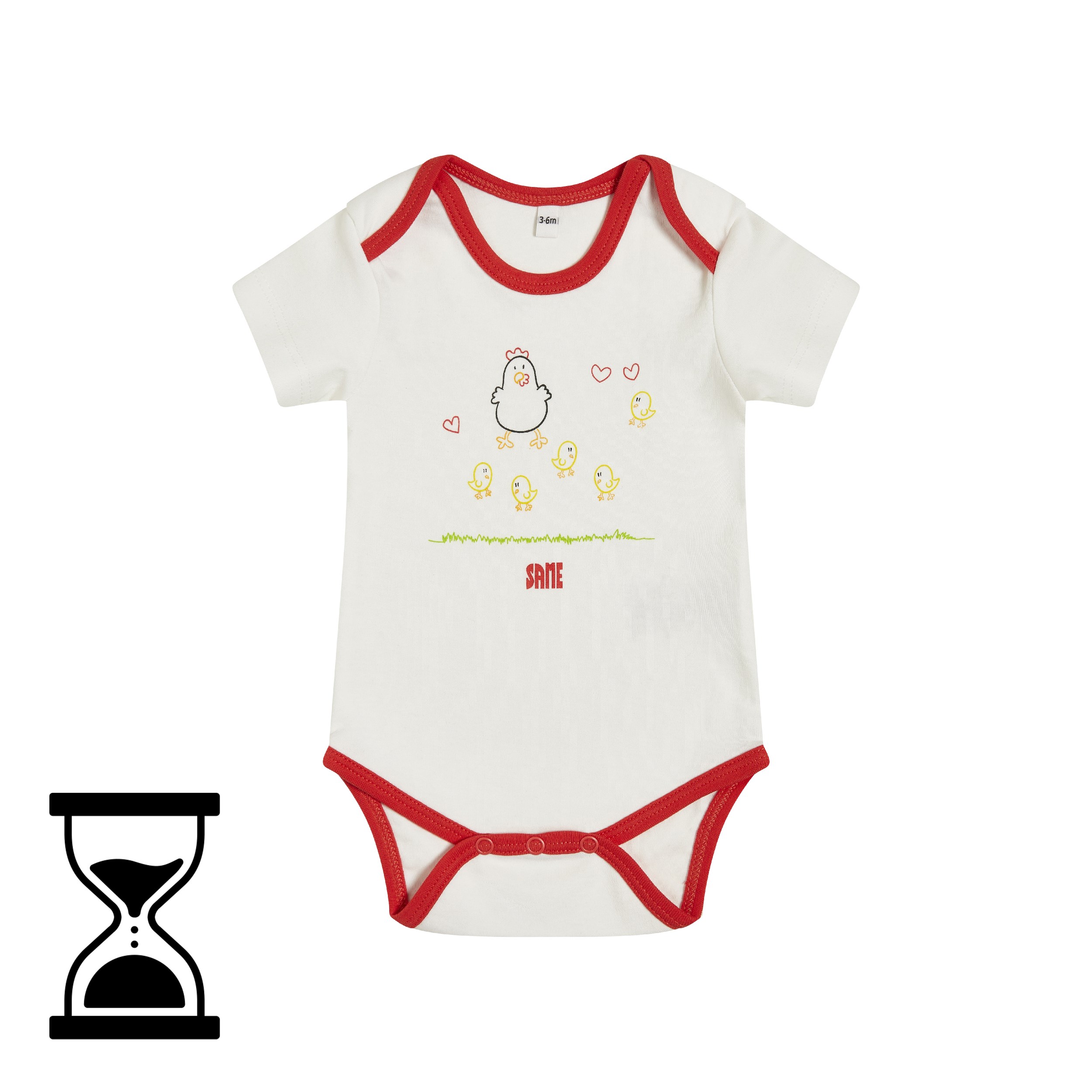 Der kurzärmelige SAME Baby-Body ist ein entzückendes Kleidungsstück für die Kleinsten, das ganz aus weißem Baumwollstoff besteht. Die Bündchen sind in roter Kontrastfarbe gehalten und zeigen auf der Vorderseite einen Kükenaufdruck sowie das rote SAME-Logo. Darüber hinaus ist der Body mit einem praktischen Verschluss ausgestattet, der ein einfaches An- und Ausziehen ermöglicht.